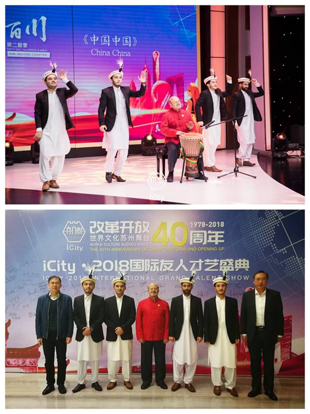 我校巴基斯坦籍留学生和芬兰友人艾哲罗合作表演了歌舞曲目《中国中国》。艾哲罗先生已在苏州生活了20个年头,曾于2003年至2006年间在我校担任外教。他饱含对中国之爱和深情的歌声、节奏感十足的击鼓声与留学生同学表演的巴基斯坦传统舞蹈、助演嘉宾表演的的新疆舞蹈融合在一起,别有一番风味,赢得了现场观众的热烈掌声,获得本次盛典“最佳艺术传承大奖”。我校获颁“突出贡献组织奖”。
